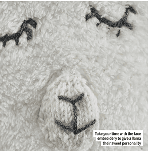 cast-on edge open, then turning them right side out. Sew both Ears to the top of the Llama Bag. The Flowers are made by rolling the knitted piece from the smaller petals to the larger petals to make a rose shape. Sew the bottom of the Flowers to secure into place, sew one leaf to each Flower. Place the Flowers at the top of the Bag. Sew the Strap to the back of the Bag. Make seven small 5cm tassels and